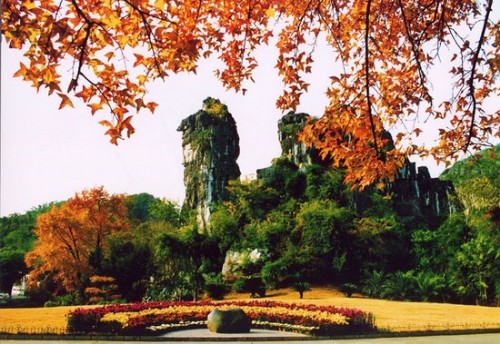 七星公園は市内の漓江の東に位置し、桂林で最も大きく、素晴らしい総合的な自然公園です。普陀山など七つの峰が北斗七星の形で並んでおり、北斗七星に似ていることから七星公園と呼ばれるようになりました。公園内には動物園、駱駝山、桂海碑林、奇石舘、七星岩、花橋、華夏広場、児童楽園などがあります。最も人気があるのは動物園で、規模は小さいですが、園内に珍しい動物であるパンダ、金糸猴、東北虎等がいます。駱駝山(らくだ山)も公園内で人気のある場所の一つです。山が一頭の巨大なひとこぶ駱駝(らくだ)のような形をしていることから名づけられました。桂海碑林には歴代上有名な人が書いた文章や、詩歌等が洞窟の壁に刻まれており、観賞、歴史研究の材料として使われています。
