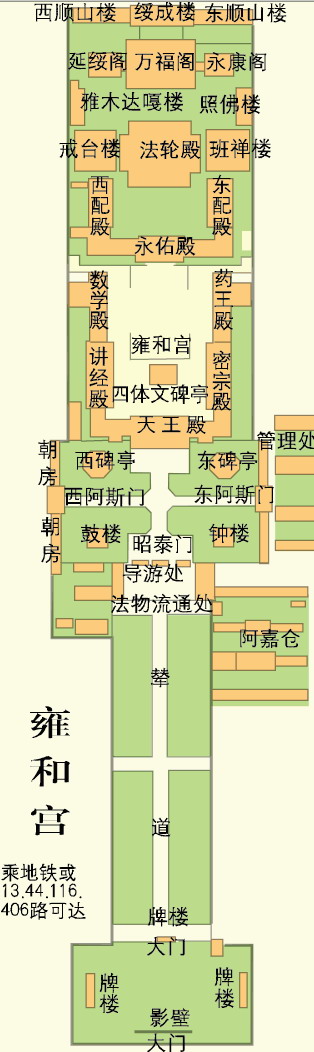 名所の概要 全国重要文化財。北二環東南隅にあり、北京地区に現在唯一存在した最大のラマ教のお寺である。初期は清代雍正皇帝が就任した前に住んでいた場所で、乾隆年間にラマ廟に改造し、清代の政府が全国ラマ教を管理する事務センターとなった。1981年、正式にオープンした。1997年、北京市文化財局にチケット教の芸術博物館として指定した。 雍和宮は、チベット教のお寺を改造された後、仏教の伝統的なである仏日を継承した上に、自身の祭日を設定し現在まで維持してきた。旧暦の毎月の一日、十日、十五日、三十日の午前に例行の集会以外に、每年に重大な法事も設定した。旧暦一月二十三日から二月一日にある「大愿祈祷法会」は雍和宮の最も盛大な祭日の一つである。法会は「金剛駆魔神舞」を踊り、それは跳布扎とも呼ばれている。民間では「打鬼」とも言い、邪を駆逐し、吉祥を祈る意味である。旧暦四月十三日から十五日にある「千供法会」はお釈迦様と、成仏、涅磐の三期同慶の日であり、仏吉祥日とも呼ばれている。西暦九月二十四日から三十にある「大威德壇城法会」は、お坊さんは仏法を習い、金剛の威力を借りて邪気を駆逐し、国泰民安を祈る意味である。旧暦十月二十五日にある「宗喀巴大師上師供法会」は、燃灯節とも呼ばれている。宗喀巴大師はチベット教の創業者で、有名な宗教改革家である。大師が亡くなった記念日に、雍和宮のお坊さんは大師のために千本以上の灯を点り、千灯より照らして大きく光るという意味がある。