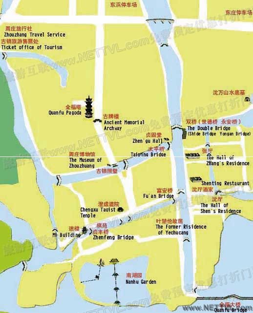 街の中は水路が縦横に走り、元明清時代に築かれた橋が14箇所残っている。中でも双橋と富安橋は有名。双橋は世徳橋と永安橋という異なる二つの橋が縦横に続けて架けられたユニークな形をしている。著明な画家陳逸飛がこの橋を描き、アメリカの石油会社の社長が買い上げ、鄧小平に送ったことで周庄の名は一躍有名になった。