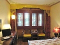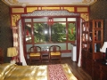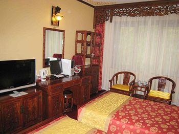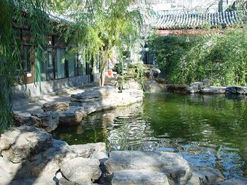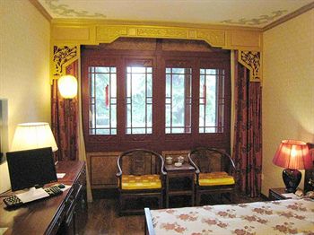 園内には楼閣が立ち並び、建物は廻廊がつなぐ。柱は朱色、壁は緑色いかにも中国的で華やかだ。竹林が生い茂り、噴水や築山が点在し実に閑静優雅だ。春は花が咲き乱れ、夏と秋は竹林がそよ風に従って揺れ冬は白い雪と青松、とホテルのリーフレットはうたう。そして客室は北京の伝統的な住居―四合院式。